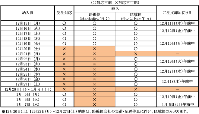 年末年始の配送業務は、例年の事ながら交通渋滞、物流会社の休業等により、輸送手段確保が難しい状況となりますので、余裕を持ってご注文いただきますようお願い申し上げます。弊社および物流会社も最善の努力を致す所存でございますが、事前にご理解、ご協力を賜りたくお願い申し上げます。