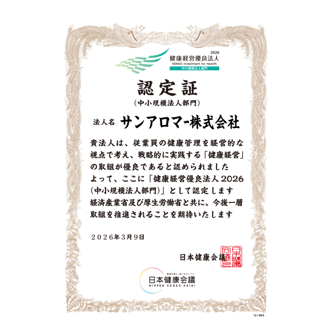 サンアロマー株式会社は、経済産業省と日本健康会議が認定を行う「健康経営優良法人認定制度」において、「健康経営優良法人2026(中小規模法人部門)」 に4年連続で認定されました。